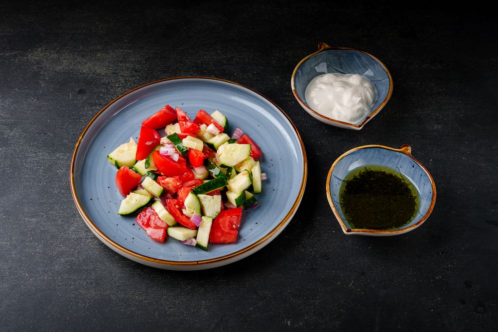 Салат из свежих овощей, подается с двумя видами заправки