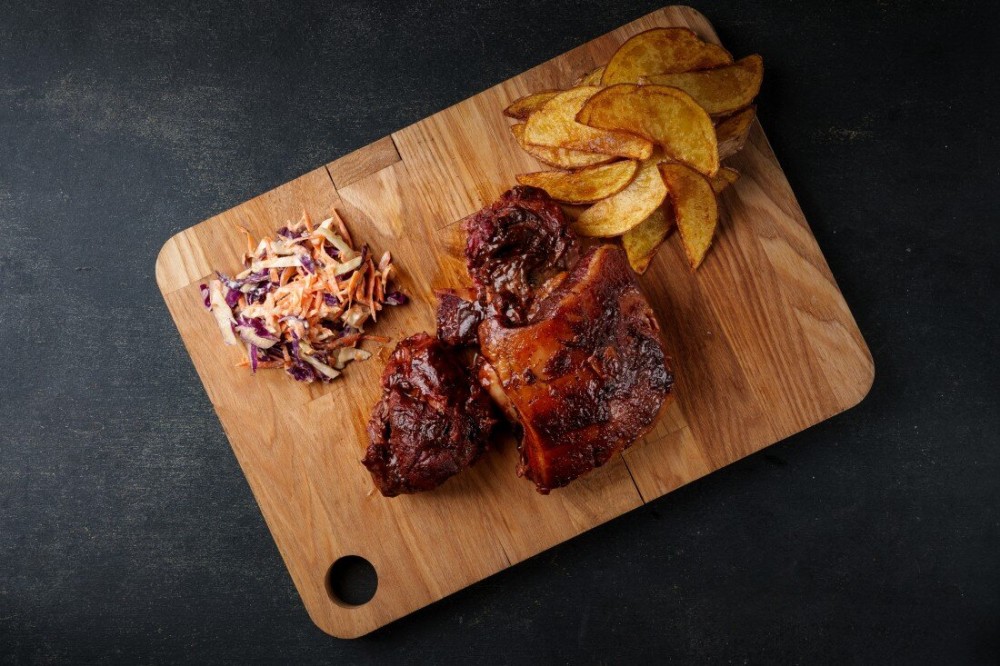 Ребра конины томятся до идеальной мягкости и покрываются насыщенным соусом ШMEAT. Подаем с горячими картофельными дольками и салатом коул слоу